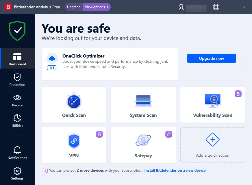 Il software offre servizi gratuiti, senza requisiti nascosti o periodi di prova. È possibile scaricare e installare l'app, creare un account Bitdefender Central e passare a un'esperienza antivirus gratuita e senza problemi . Inoltre, il programma offre anche un'integrazione semplice per l'account online di Bitdefender Central. Tuttavia, la versione online presenta funzionalità limitate, pur offrendo la stessa interfaccia, architettura, scanner antimalware e supporto back-end.